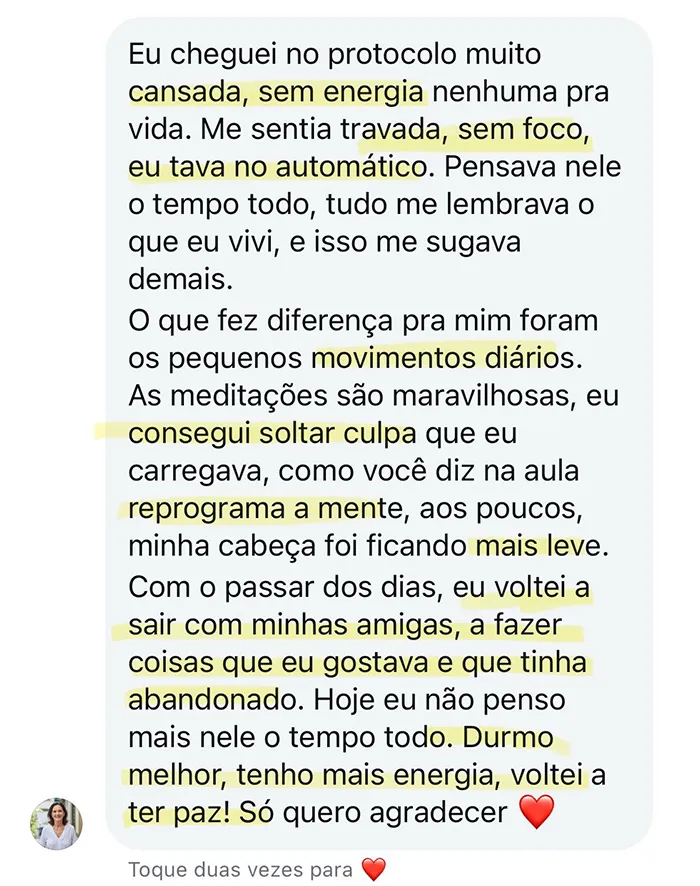 e voltar a confiar em si mesma, recuperar energia, retomar seus projetos e finalmente seguir a sua vida com mais paz e direção.