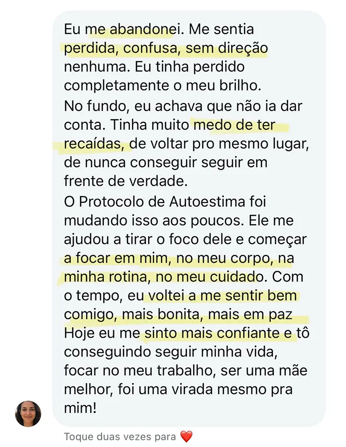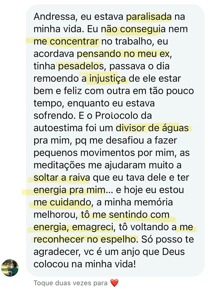 Com toda essa bagagem em transformação emocional profunda, Andressa criou o Protocolo Autoestima de volta em 21 dias Um método prático para resgatar sua autoestima e autoconfiança, silenciar a mente, e voltar a ter foco e energia para viver seus projetos e sonhos.